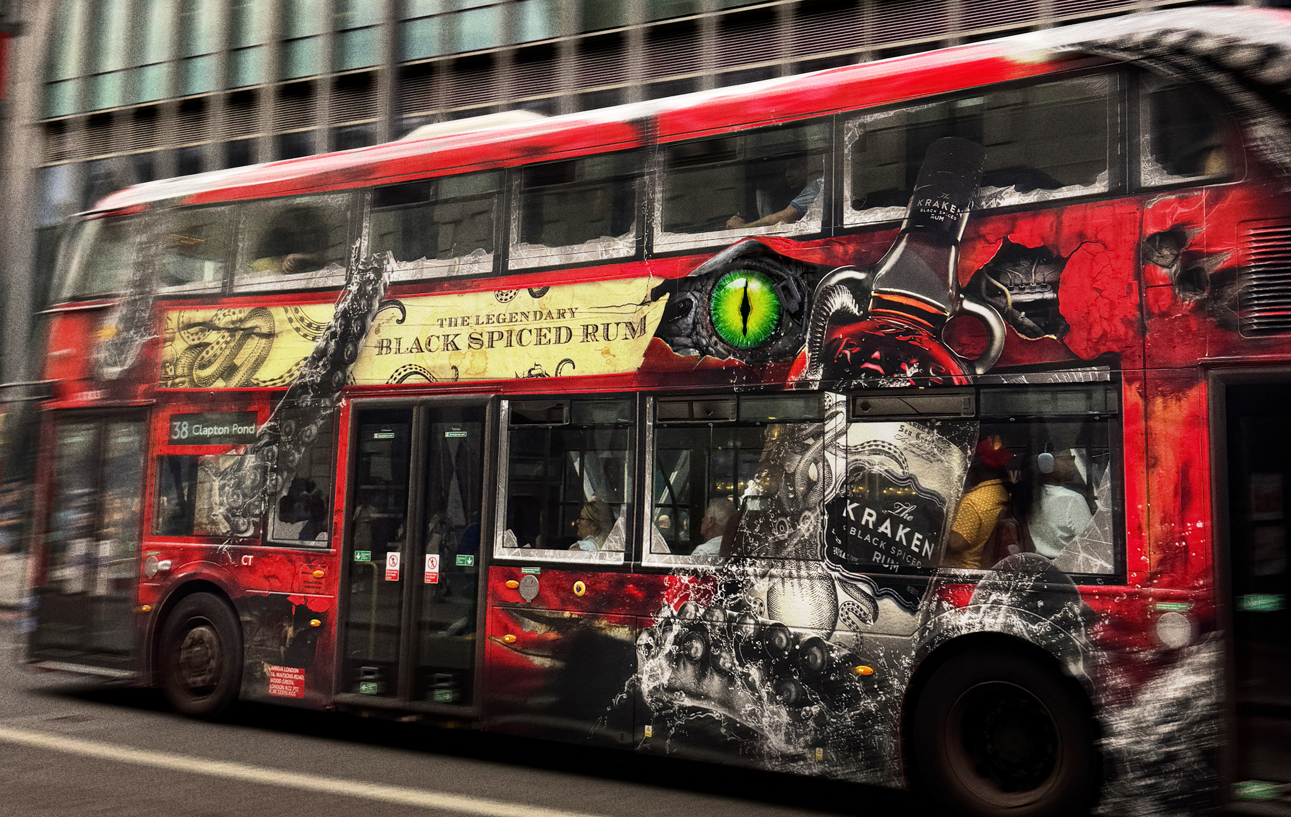 Working closely with the Kraken team as well as TfL London, I produced the various large artwork files needed to create this bus wrap. I wanted real metal textures and distressed vehicle damage to try create the most realistic look possible.